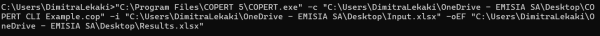 Since COPERTv5.8, CLI can also point an existing ".cop" file except for the COPERT execution path (e.g. "C:\Program Files\COPERT 5\COPERT.exe"). With this way, the user may select one of the existing cop files and perform any additional changes via CLI. The CLI execution syntax for this purpose is the following: "C:\Program Files\COPERT 5\COPERT.exe" -c "D:\COPERT_CLI\COPERT CLI example.cop" -i "D:\COPERT_CLI\Input.xlsx" -oEF "D:\COPERT_CLI\Results.xlsx".